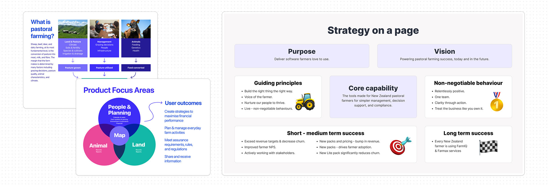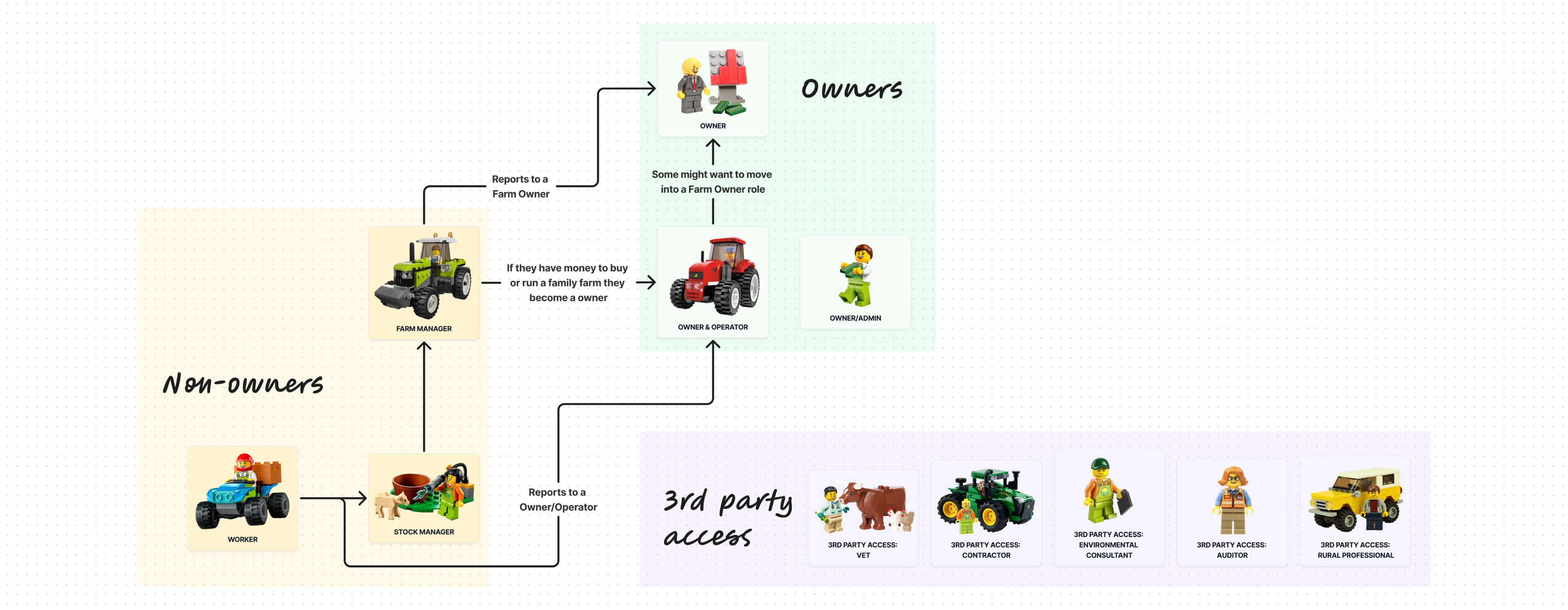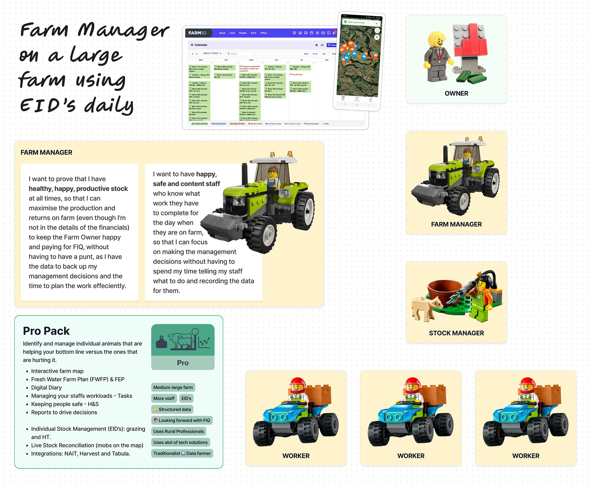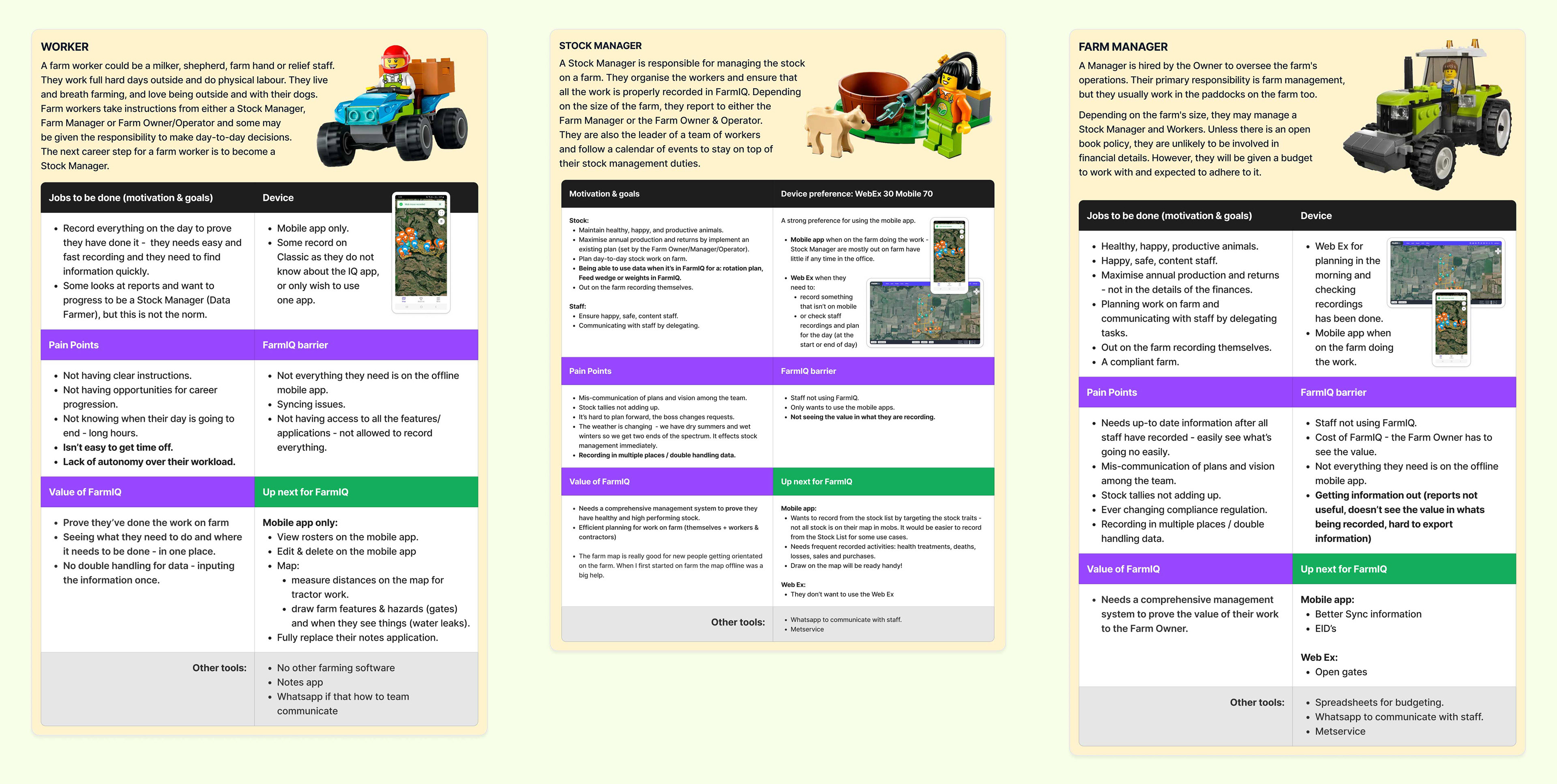 I led a refresh of our customer understanding through research. Every interview began with consistent “farmer introduction” questions, and each session produced a farmer‑on‑a‑page summary. With SMEs, we co‑created role definitions across farm owners, farm managers, stock managers, workers, and third‑party users, and paired them with Jobs‑to‑Be‑Done to focus on outcomes that matter (e.g., record fast in the paddock, make confident decisions on-the-go). We also acknowledged technology‑adoption differences to understand when mobile‑first simplicity was non‑negotiable.